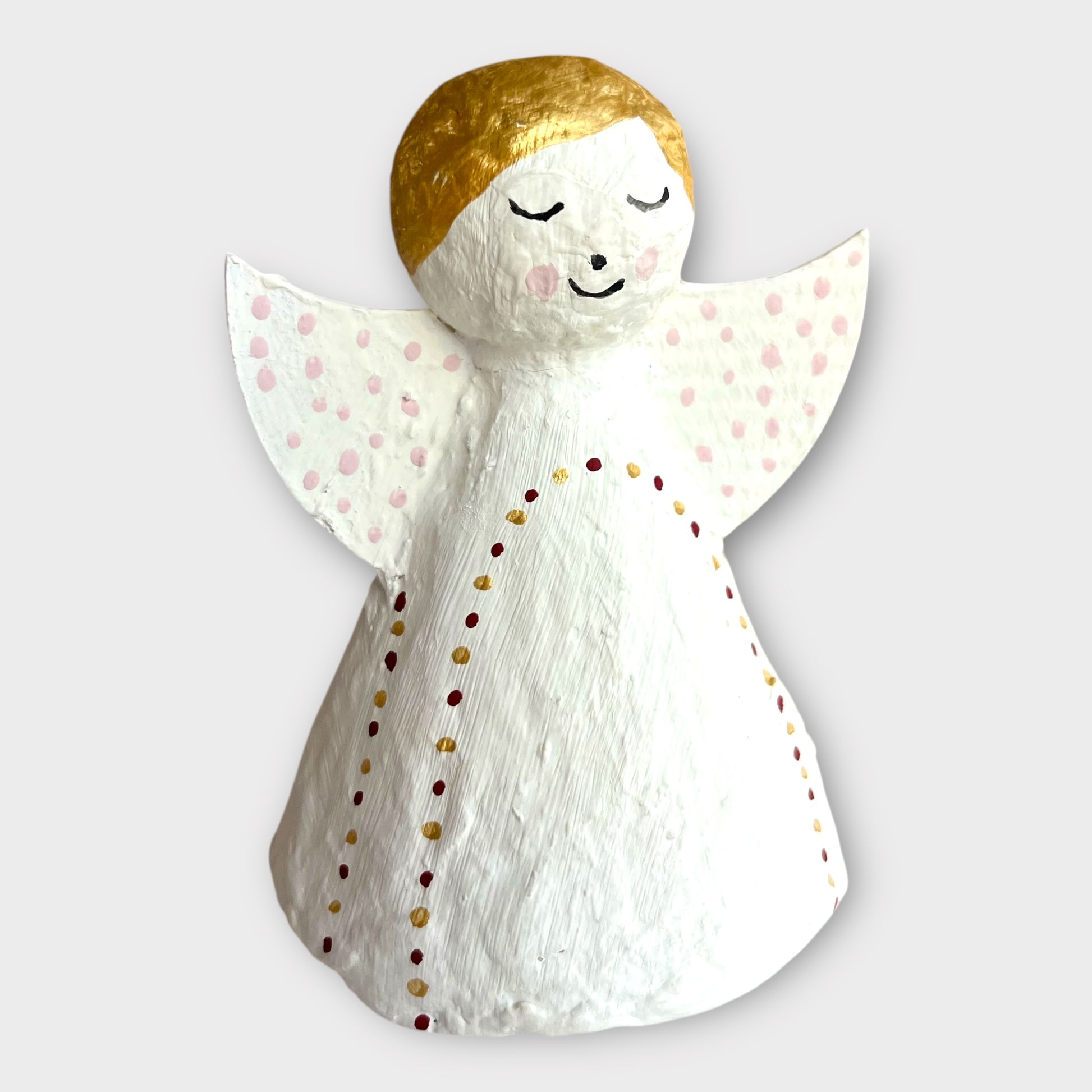 Hvid håndlavet engel med guldhår – juleophæng i genbrugspapir