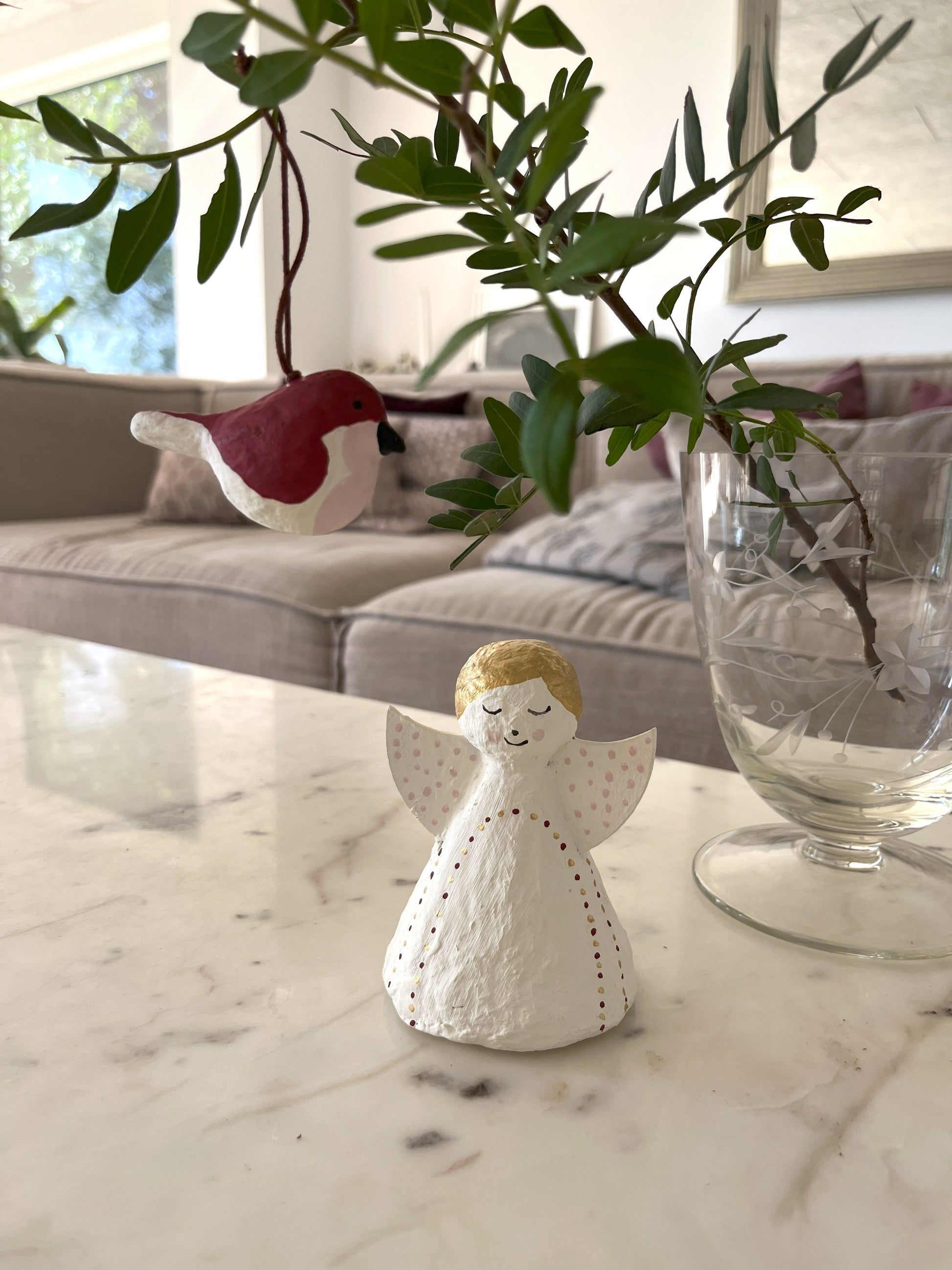 Smuk, håndlavet hvid engel med guldhår – perfekt til jul, borddekorationer eller som del af en stemningsfuld vinterudsmykning. Den enkle form og varme detaljer gør englen ideel som gave eller klassisk julepynt.