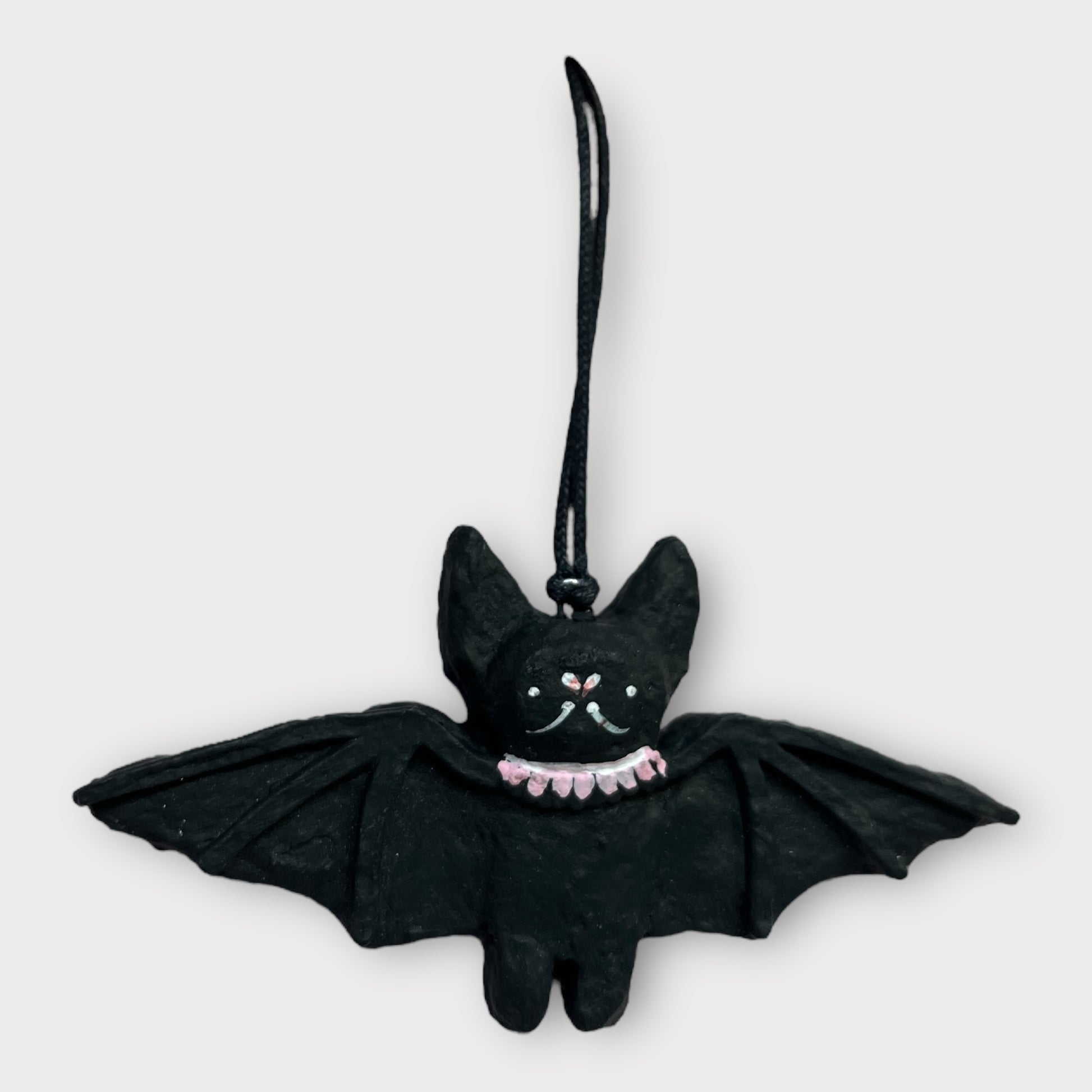 Sort flagermus med små øjne og fine detaljer – klassisk Halloween-figur til ophæng.
