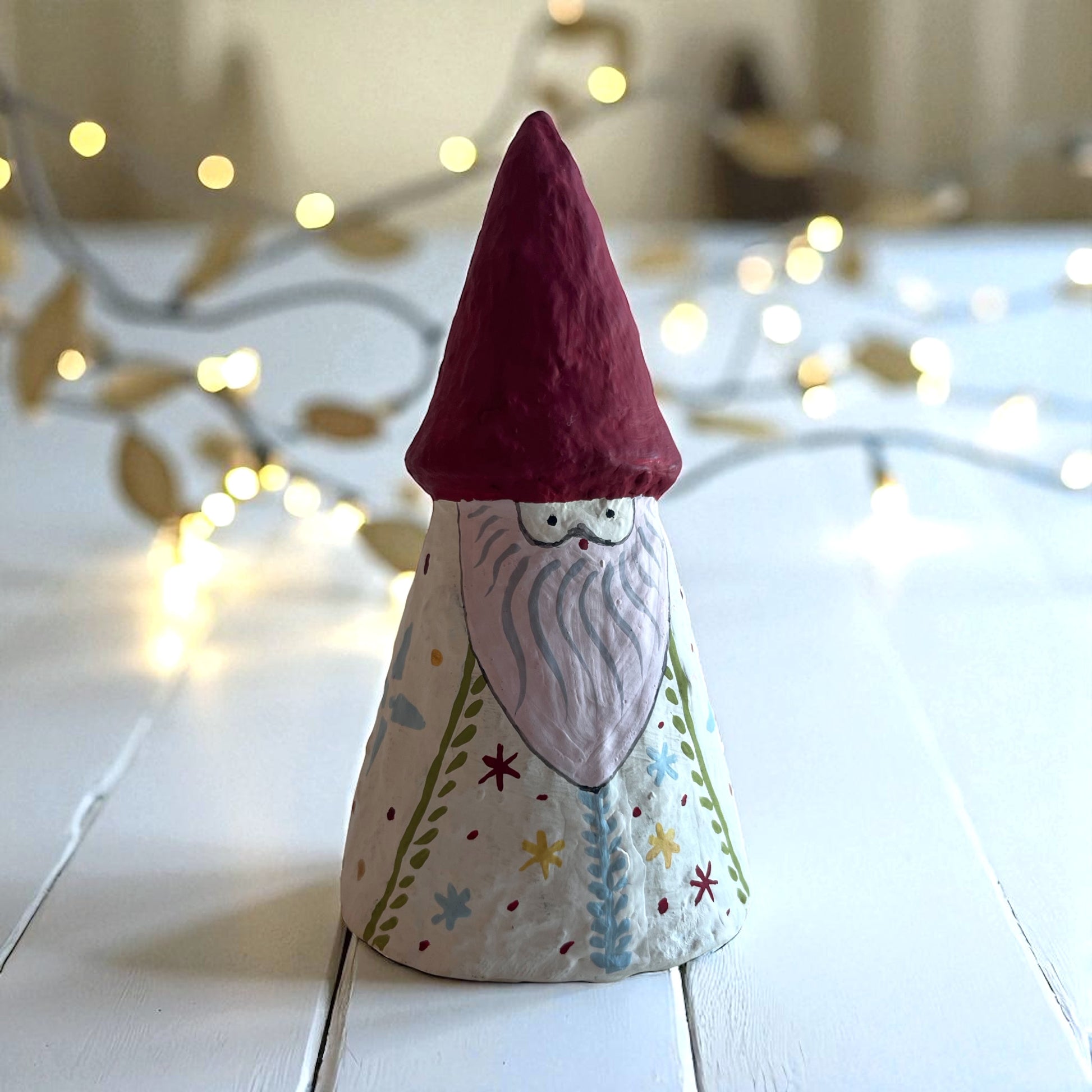 Håndlavet julenisse med rød hat og fine, håndmalede detaljer – perfekt som juledekoration på hylder, borde eller i vinterlige udstillinger. Den varme farve og bløde cotton mache-struktur giver et charmerende og klassisk udtryk.
