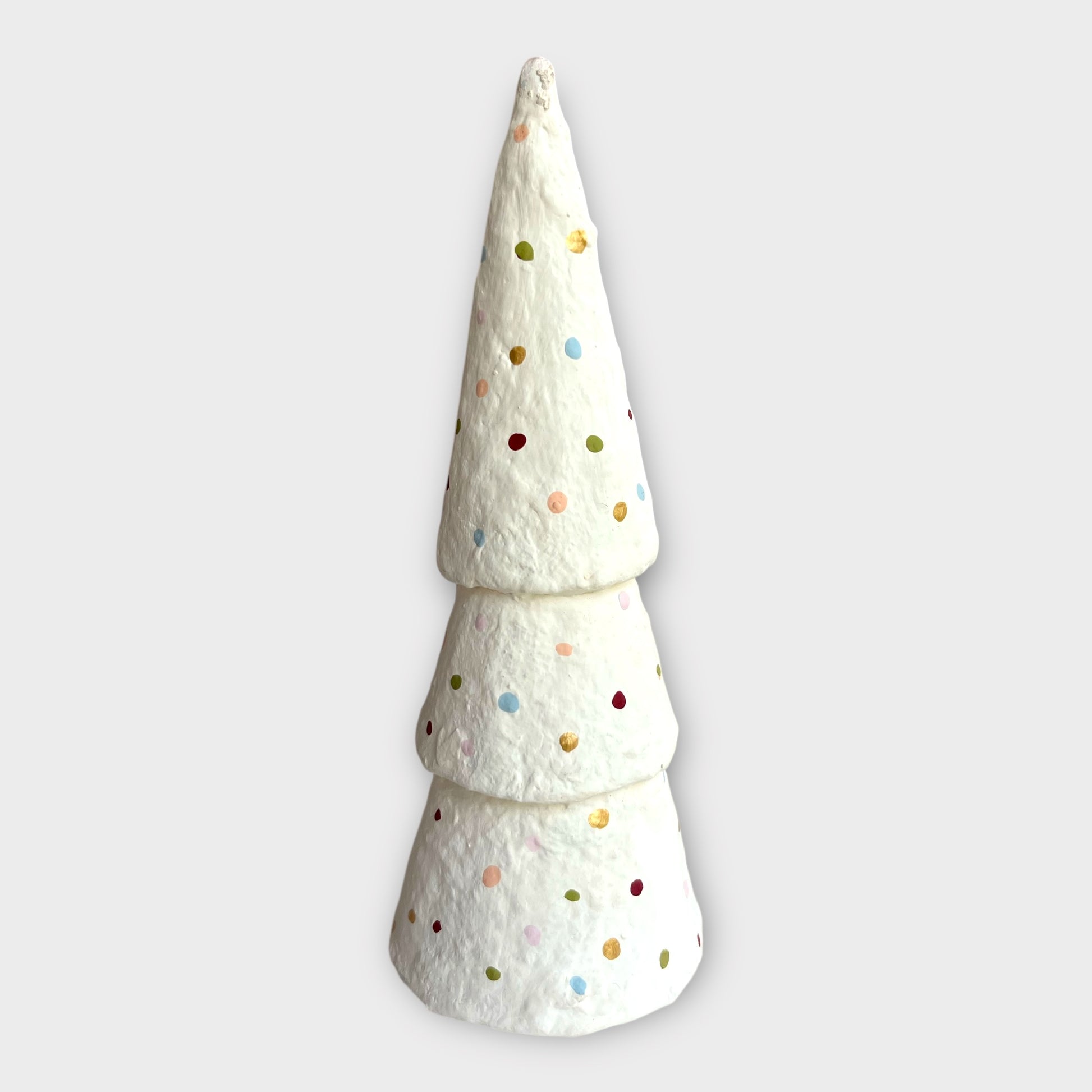 Hvidt juletræ med små multifarvet prikker – enkel og dekorativ.