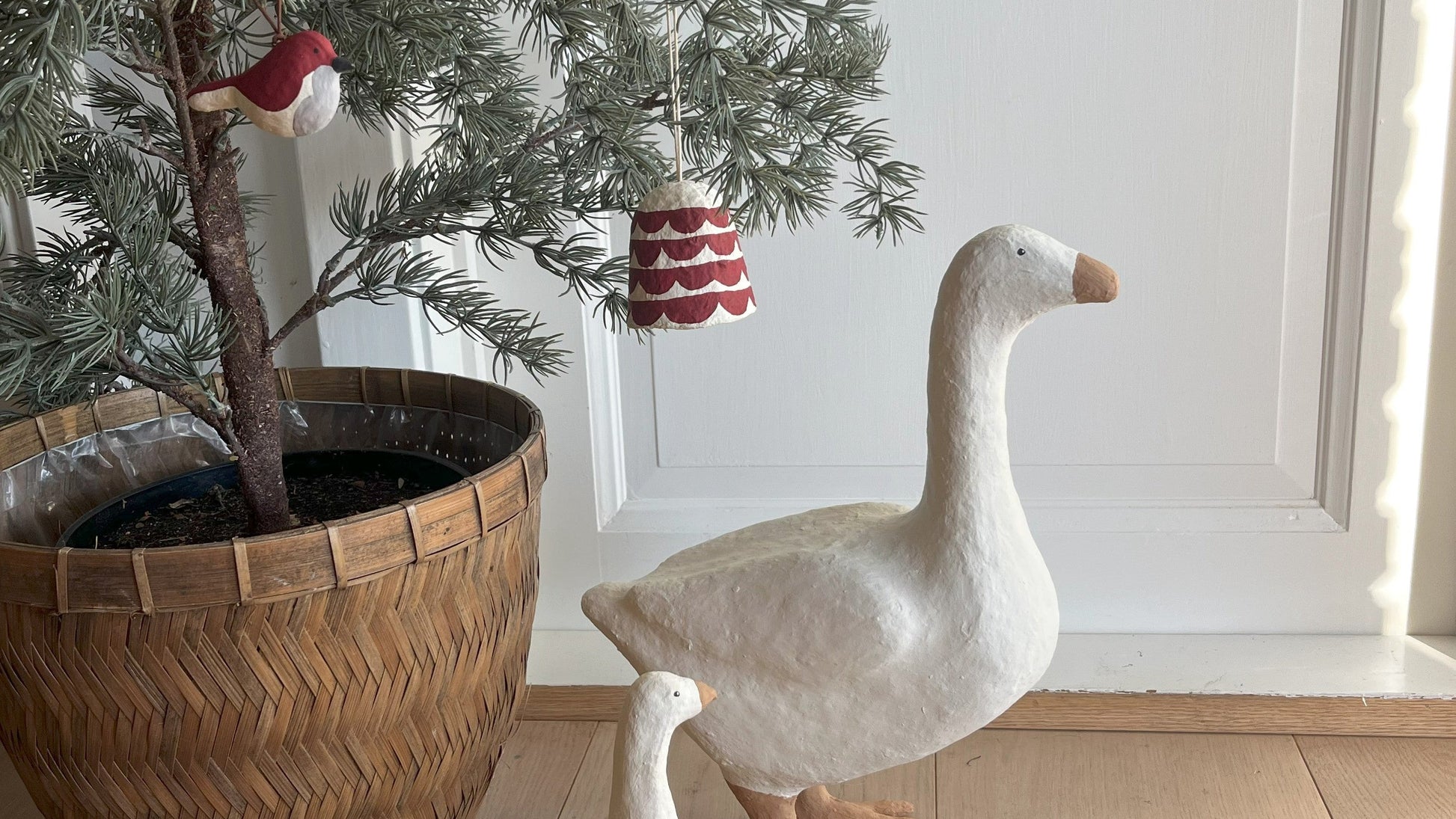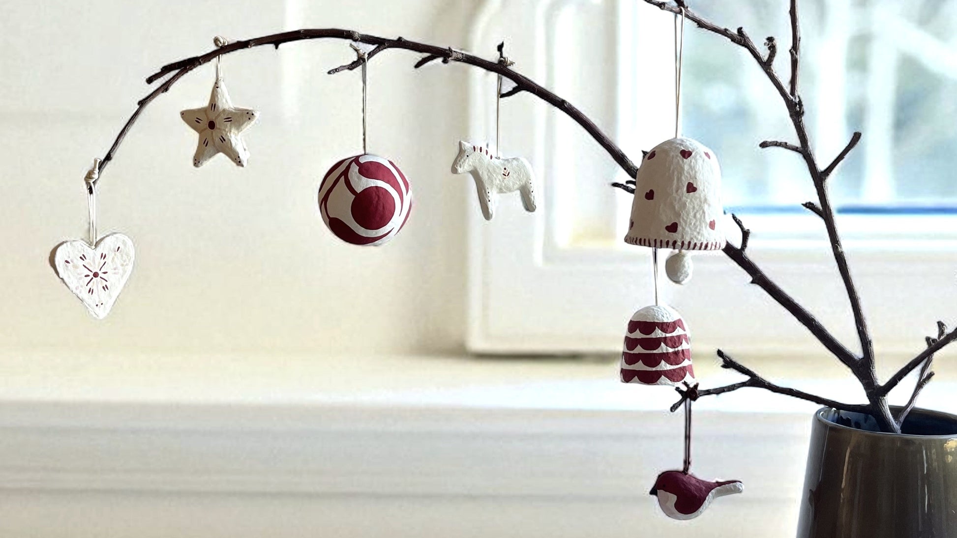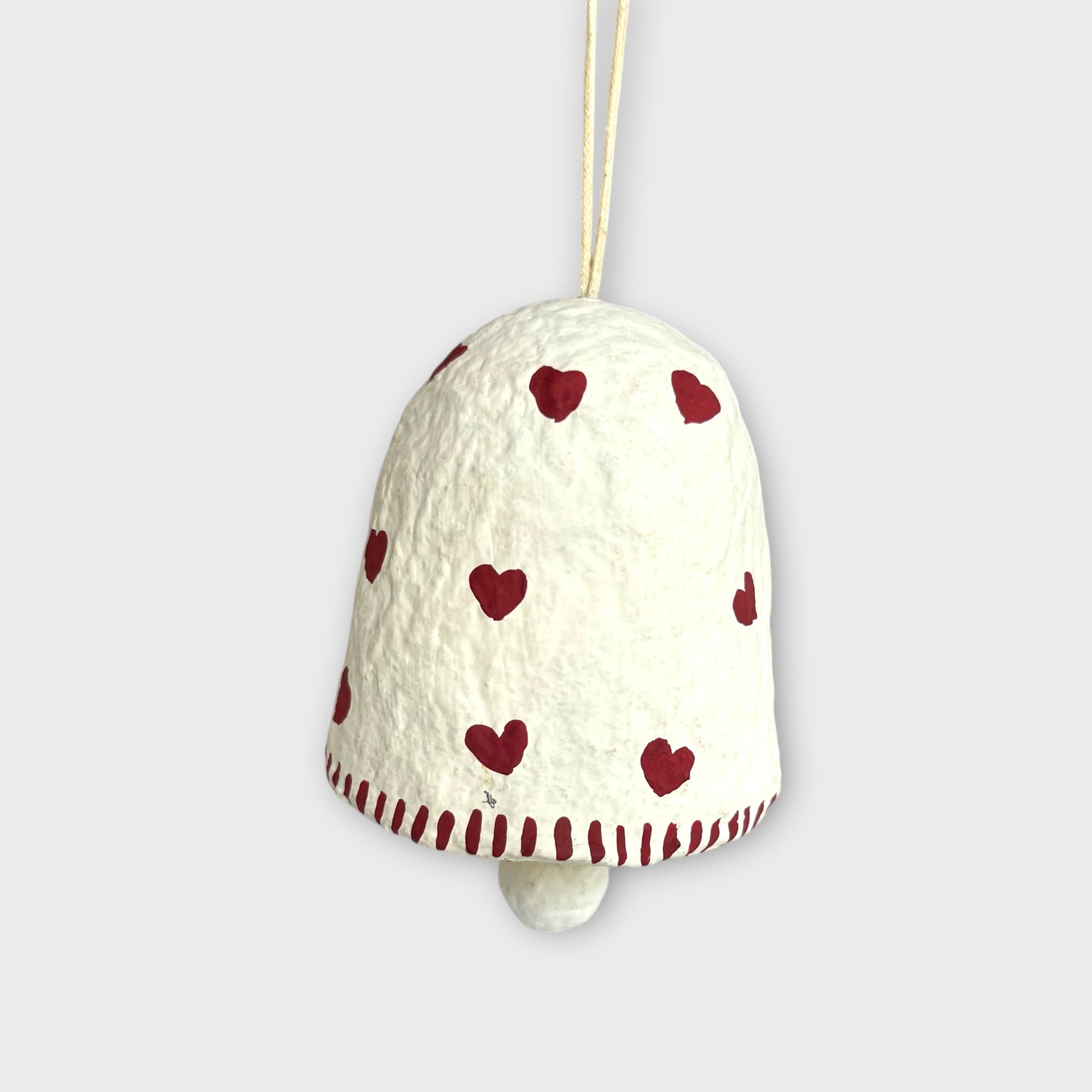 Håndlavet klokke med små røde hjerter – en hyggelig og dekorativ detalje til juletræet, en gren eller vinterlige udsmykninger. Den bløde struktur og fine farvekontrast giver et varmt og klassisk udtryk, som passer ind i både moderne og traditionelle julemiljøer.