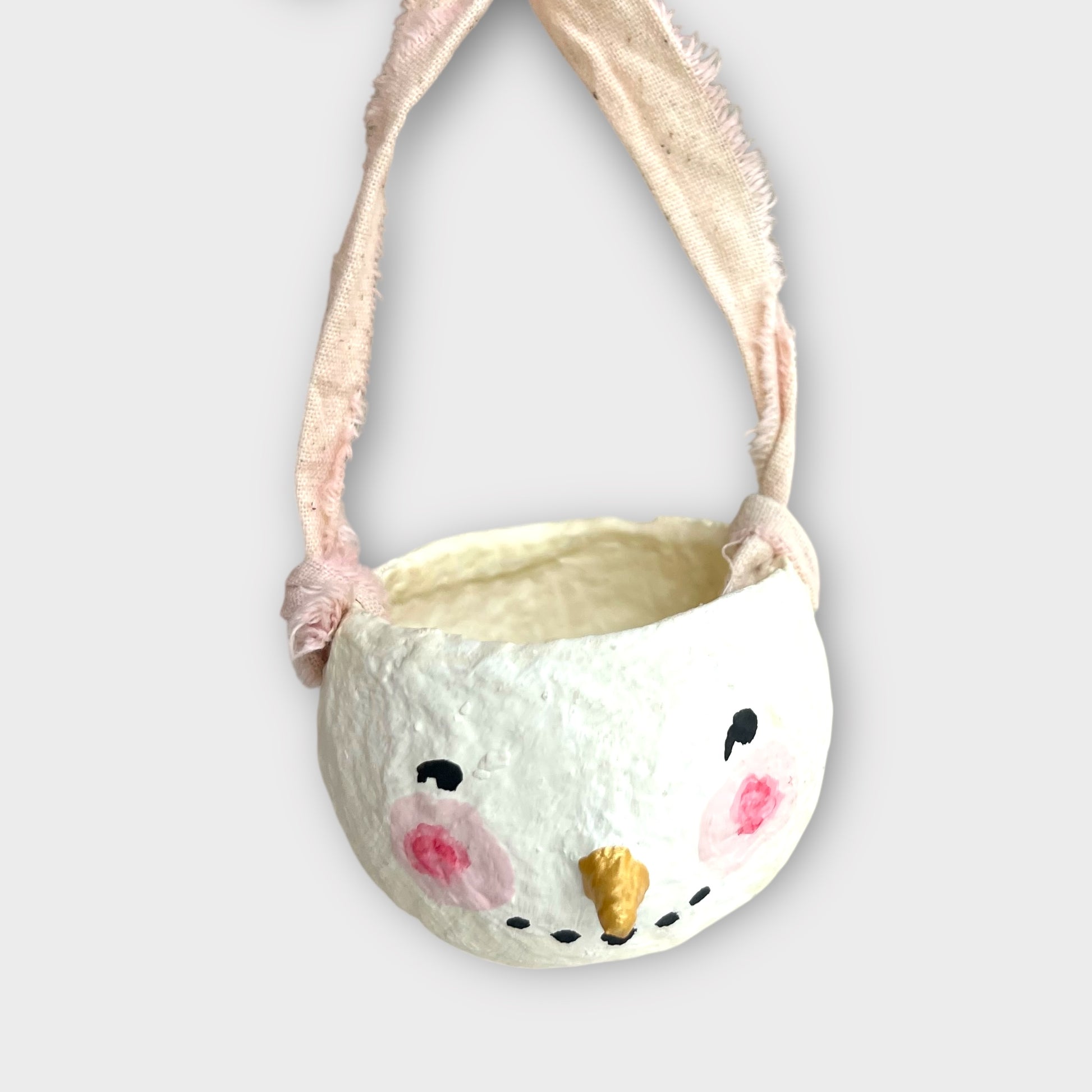 Håndlavet mini skål med snemandshoved og guldnæse – et charmerende lille juleophæng til træet, en gren eller en vinterdekoration. Den bløde cotton mache-overflade og det kraftige bomuldsbånd giver et hyggeligt og naturligt udtryk.