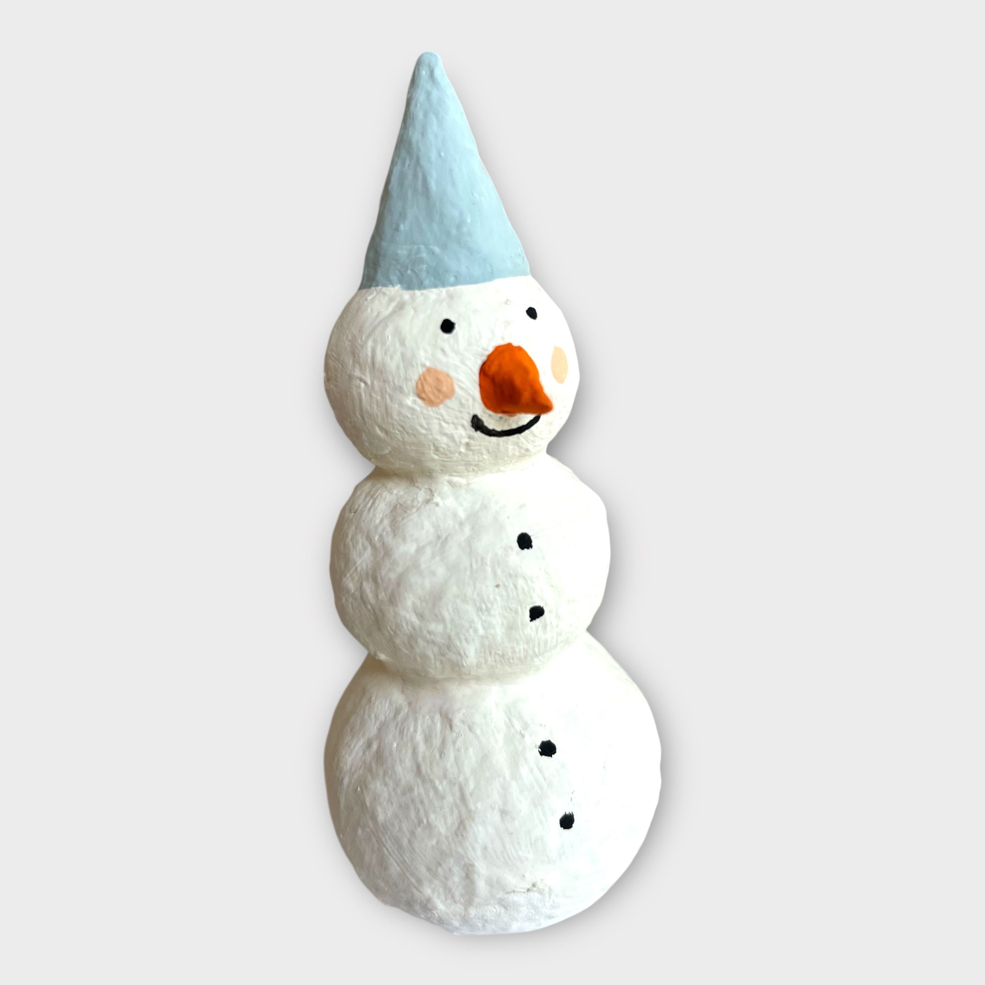 Håndlavet snemand med lyseblå hat – et tidløst og hyggeligt julepynt eller vintersæsonens dekorationer. Den runde, bløde form og det venlige udtryk giver varme og charme til enhver juleudsmykning.