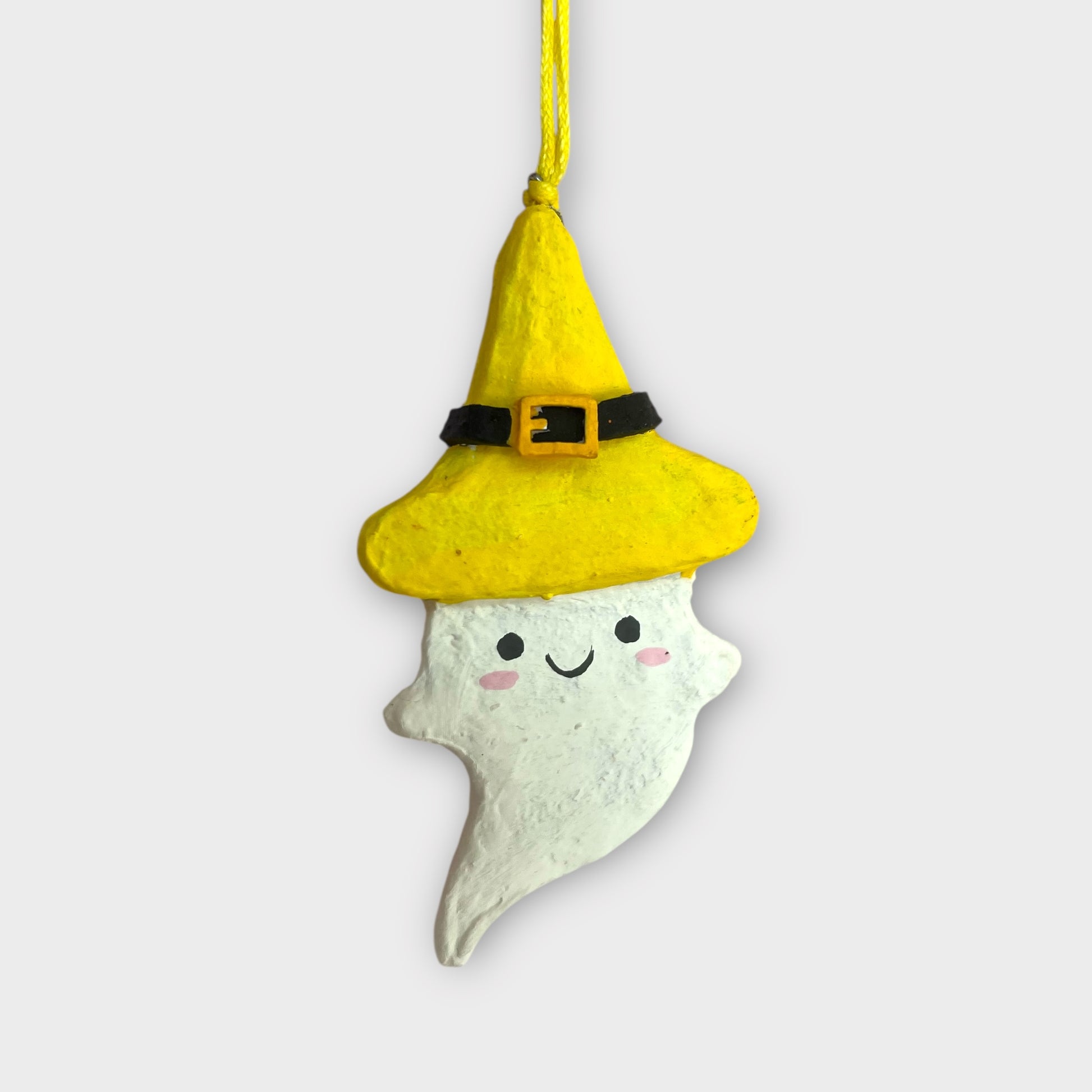 Spøgelse med gul heksehat – et herligt pust til Halloween-pynten.